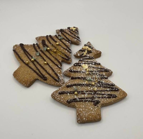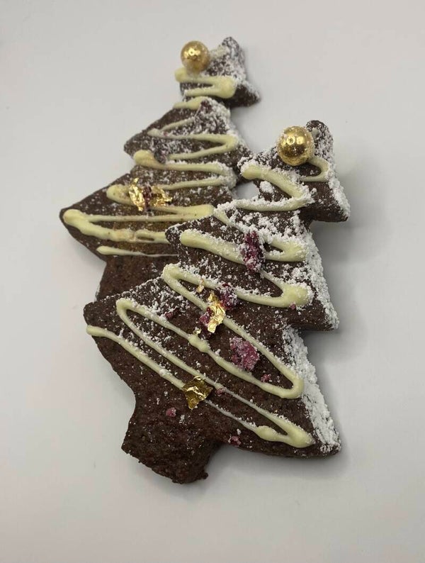 Ingrédients: Farine de blé, beurre, sucre glace bio, sucre blond bio, oeuf bio, cannelle, cacao amer, fleurs cristallisées (rose, hibiscus, violette, verveine) poudre ou feuilles ou boule d'or comestible. Chocolat blanc, chocolat noir.