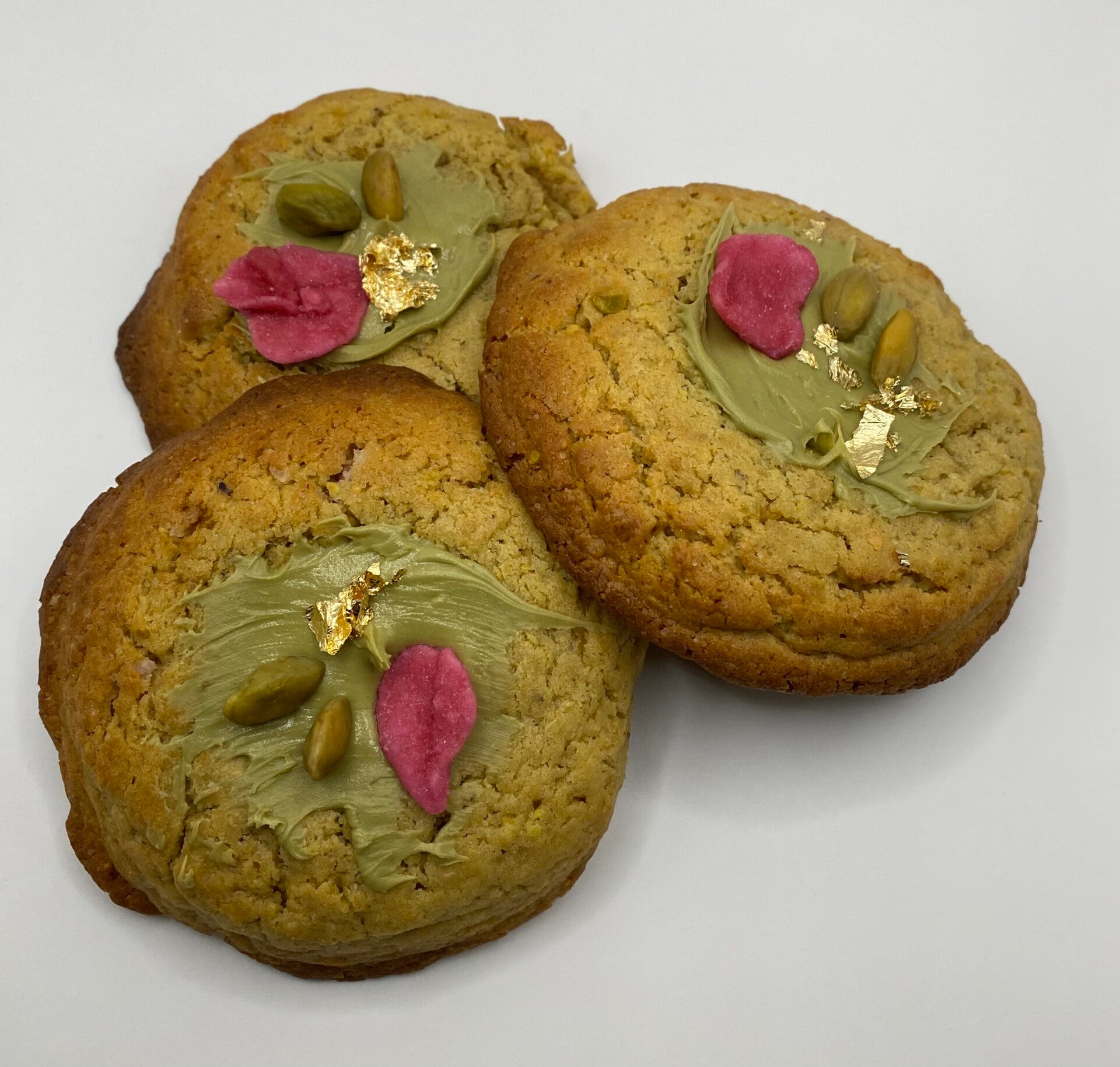 Ingrédients: Farine de blé, beurre, sucre blond bio, sucre complet,oeuf bio, levure chimique, lait, pistache d'Iran, pétales de roses cristallisées, eau de rose. contient des fruits à coques, oeufs, lactose et gluten.